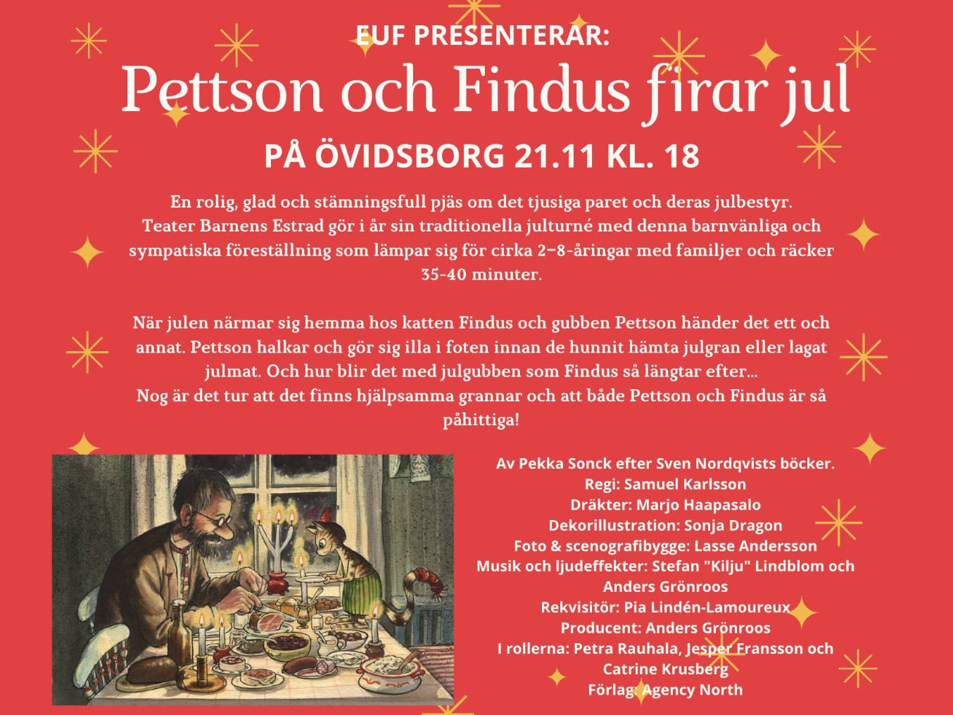 Välkommen till Övidsborg för att se på Pettson och Findus 21.11 kl. 18.00. OBS! Endast förköp! Gå till: butik.estrad.fi